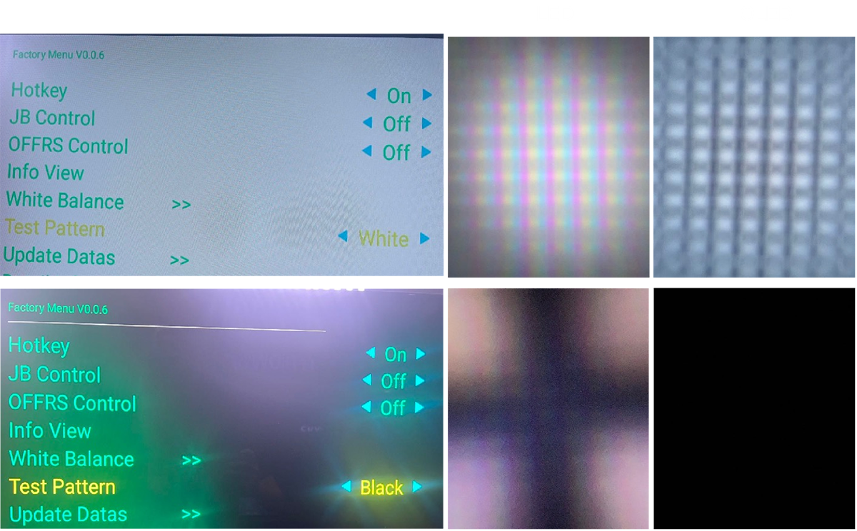 Stiskněte tlačítka 'Zdroj-doleva-doprava-doleva-dozadu' jedno po druhém, přejděte do 'Factory Menu' a zvolte 'Test Pattern' pro přepínání černobílých obrázků. Zapněte fotoaparát telefonu a umístěte fotoaparát na televizní obrazovku.